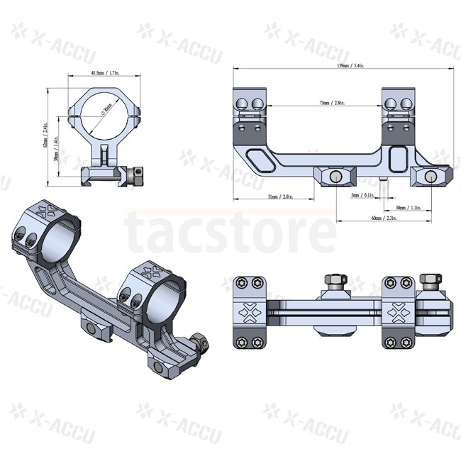 Vector Optics X-Accu 30mm 1-Piece Picatinny Mount in Black with 20 MOA forward inclination and 30mm tube diameter. Made of 6061-T6 Aluminum Alloy. Height of 38mm and weight of 155g. Length measures 139mm.