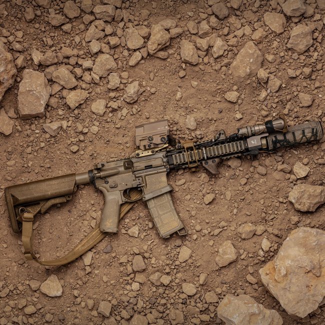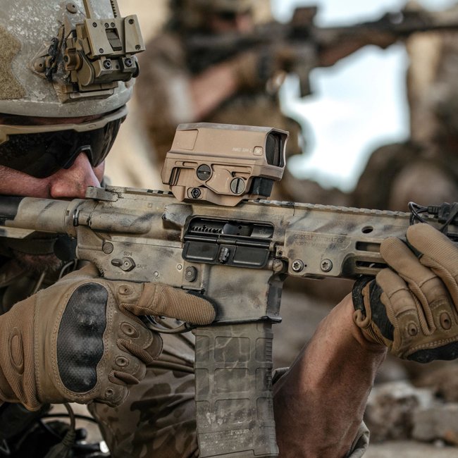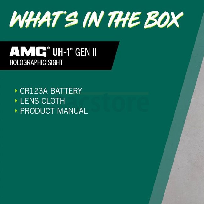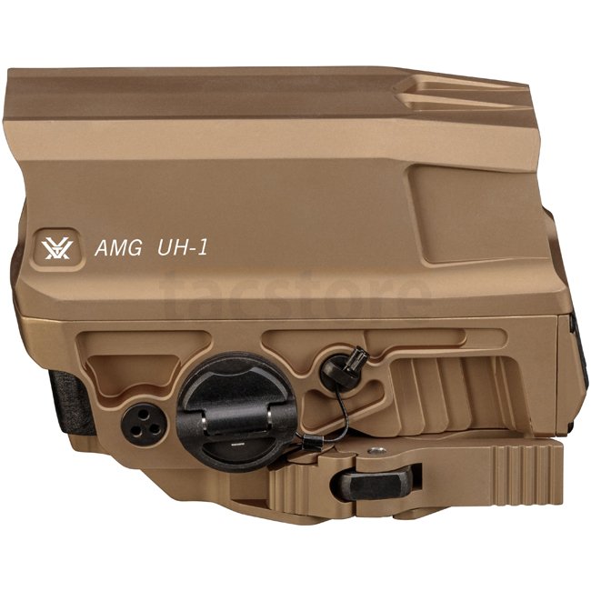 Vortex Optics AMG UH-1 Gen II Holographic Sight in Tan offers unlimited eye relief, 1 MOA dot size, 15 brightness levels, and precise adjustments with 1/2 MOA graduation and 16.5 MOA travel per rotation. It has a max 100 MOA elevation and windage adjustme