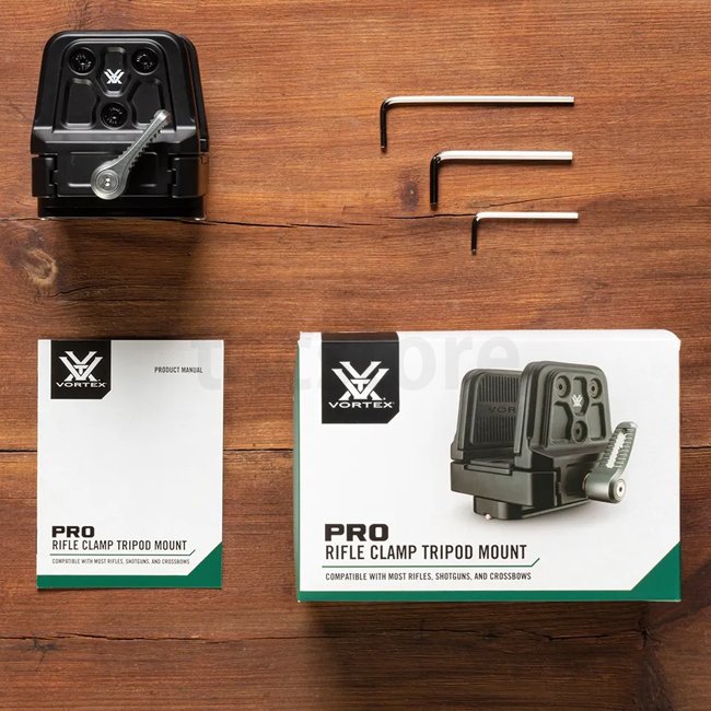 Vortex Pro Rifle Clamp Tripod Mount: Stable Rifle Mount for Precision Shooting. Tool-free installation, secure mounting for rifles, shotguns, or crossbows. Lightweight magnesium material, opening width of 1.3"–3.2", max load 44 lbs, compatible with Arca-S
