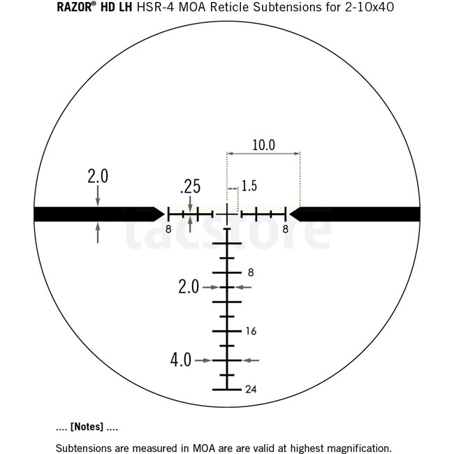 Lightweight and versatile Vortex Optics Razor HD LH 2-10x40 Riflescope with HSR-4 MOA reticle. Ideal for varying shooting scenarios. Features 2-10x magnification, 40mm objective lens, 96mm eye relief, wide field of view, 1-inch tube size, capped turrets,