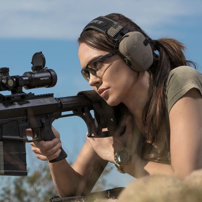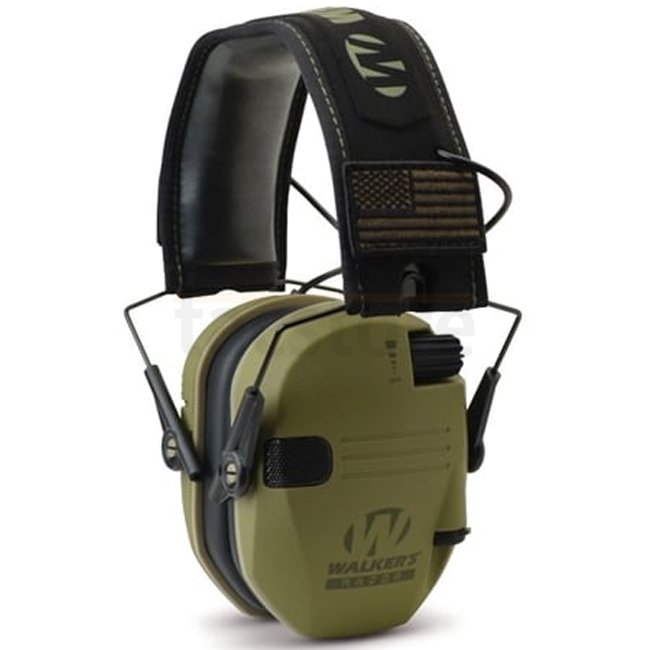 Protect your hearing with Walkers Razor Patriot Electronic Earmuff in Olive. Features ultra low-profile ear cups, high-gain microphones, sound activated compression, and audio input jack. NRR of 23dB, powered by 2x AAA batteries. Includes US Flag Patches.