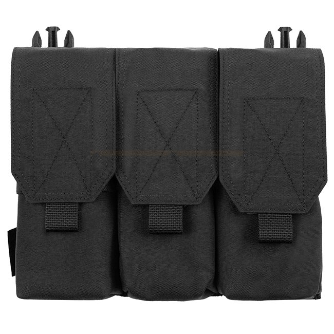 The DFP-TM4 is a removable MOLLE front panel designed to attach to the front of Warrior's Recon Carrier (RPC) via two vertical SQM clips. This panel features triple 5.56mm M4 pouches, accommodating a total of six 5.56mm x 45mm M4-style magazines, including P Mags, SA80, H&K 416, Diemaco, and Sig 516. The pouches have roll-back lids that can be secured in the open position for rapid magazine changes.