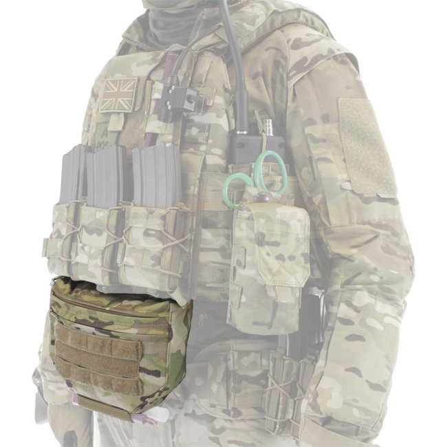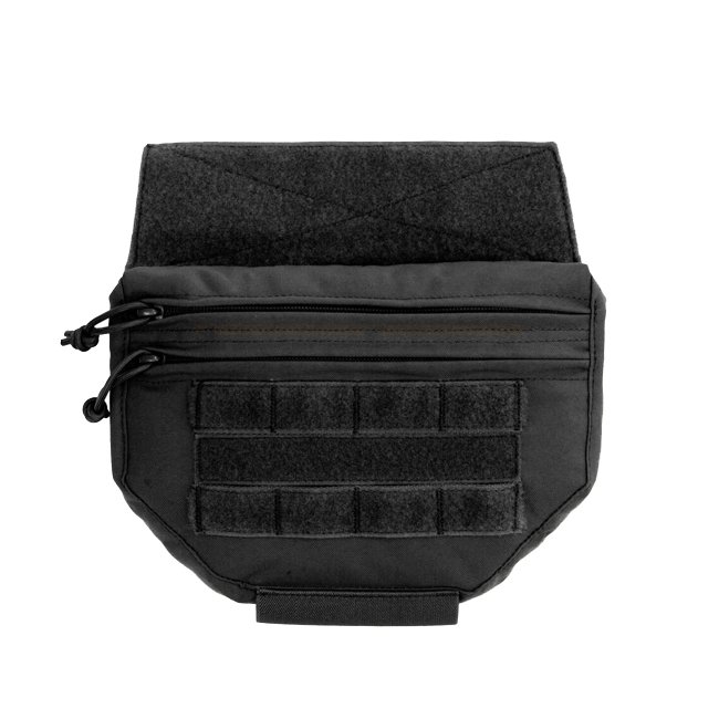 The Warrior Drop Down Utility Pouch in Black offers versatile velcro attachment compatible with all Warrior vests, plate carriers, and most chest rigs. Featuring front pockets, MOLLE rows for extra pouches, and a rear compartment for level IIIA soft armor