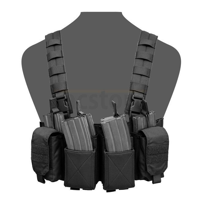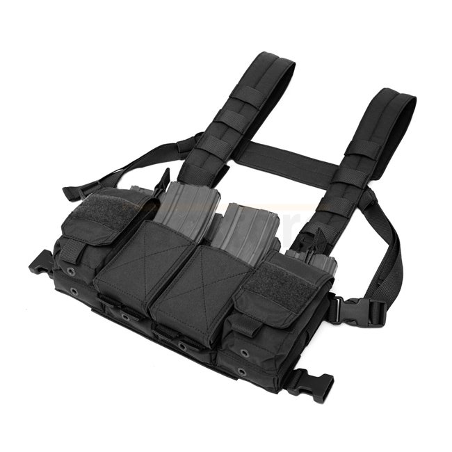 The Warrior Pathfinder Chest Rig in Black is a versatile tactical gear that can carry 4x M4 or 4x AK magazines and more. It features elastic loops for storing chemlights and torches, along with utility pouches for additional gear.