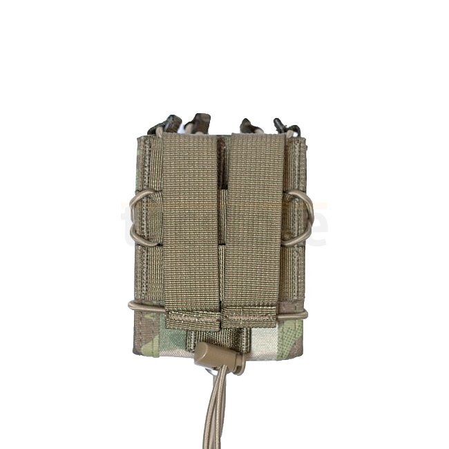 The Warrior Single Quick Mag Pouch is a versatile multi-purpose pouch designed to hold various 5.56mm magazines, including P-Mags, as well as 7.62mm x 39mm AK mags, M14, and FAL mags. This version features a fully adjustable pistol pouch mounted on the front, capable of holding a variety of pistol magazines, flashlights, multi-tools, and batons. Both pouches offer size adjustment using elastic shock cords threaded through the sides. Optional bungee retention tabs are available for those requiring additional magazine security.