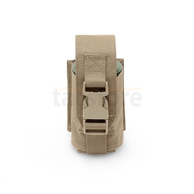 Compact coyote brown pouch for single smoke grenade. MOLLE compatible, fits grenades up to 38mm diameter. Durable and functional.