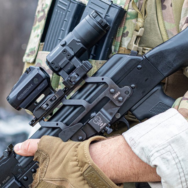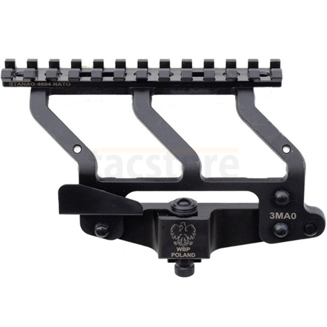 The 3MA0 Scope Mount by WBP Rogów is engineered for AK-47/AKM rifles and similar variants equipped with a side rail (dovetail). It allows for the secure attachment of various optics, including collimators, magnifiers, and scopes.