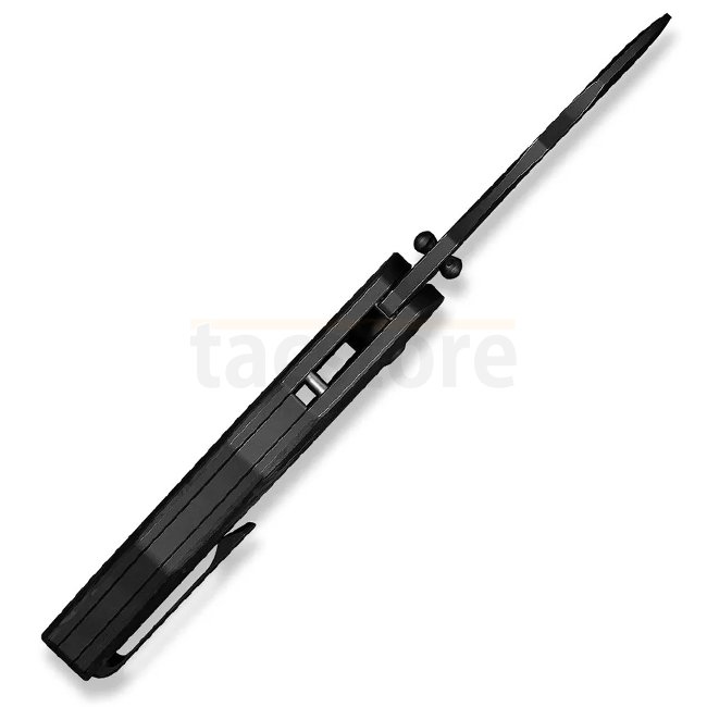 The handle is made from black 6AL‑4V titanium with inlaid shredded carbon fiber. The knife includes stainless steel liners, a ceramic ball bearing pivot for smooth deployment, and a titanium tip‑up pocket clip for right‑hand carry.