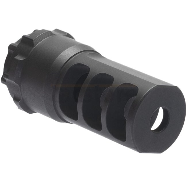 Frein de bouche efficace avec interface HexaLug pour fusils 5.56mm - M14 x 1. Compatible avec les silencieux de plus gros calibre. Idéal pour le tir silencieux, déviant les gaz chauds sur les côtés. Augmentation du bruit sans silencieux.