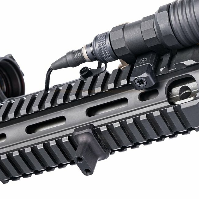 De plus, le Finger Stop fonctionne bien comme une limite vers l'avant pour empêcher les doigts de glisser des protège-mains plus courts sur un canon chaud ou un suppresseur, et comme un repose-barricade.