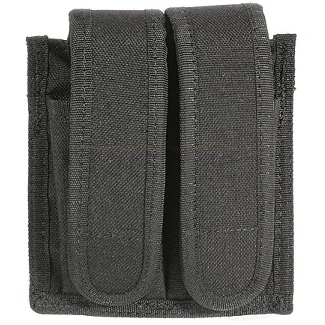 Étui universel double chargeur BLACKHAWK en noir, conçu pour contenir deux chargeurs de pistolet. Compatible avec les ceintures de service jusqu'à 2,25 pouces de large. Fabriqué en matériau Cordura résistant.