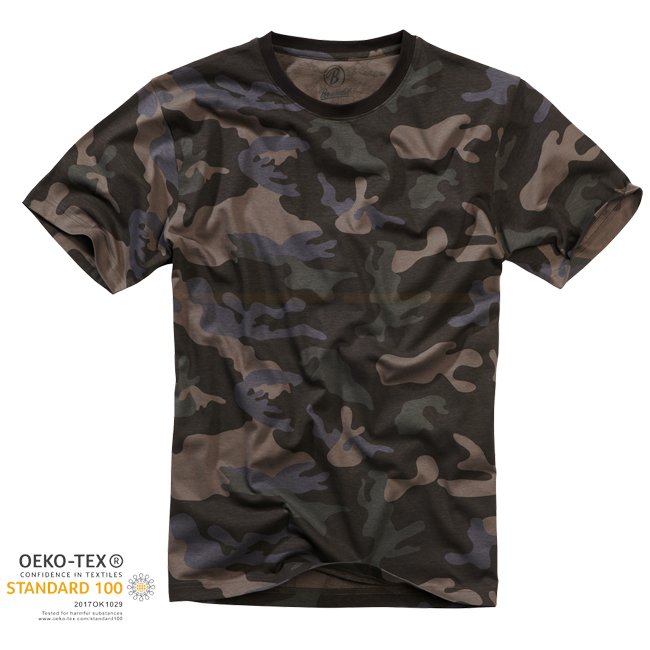 T-shirt Brandit - Camouflage Foncé - S : Tee-shirt en coton confortable au design camouflage foncé. Col rond, manches courtes, tissu 100% coton.