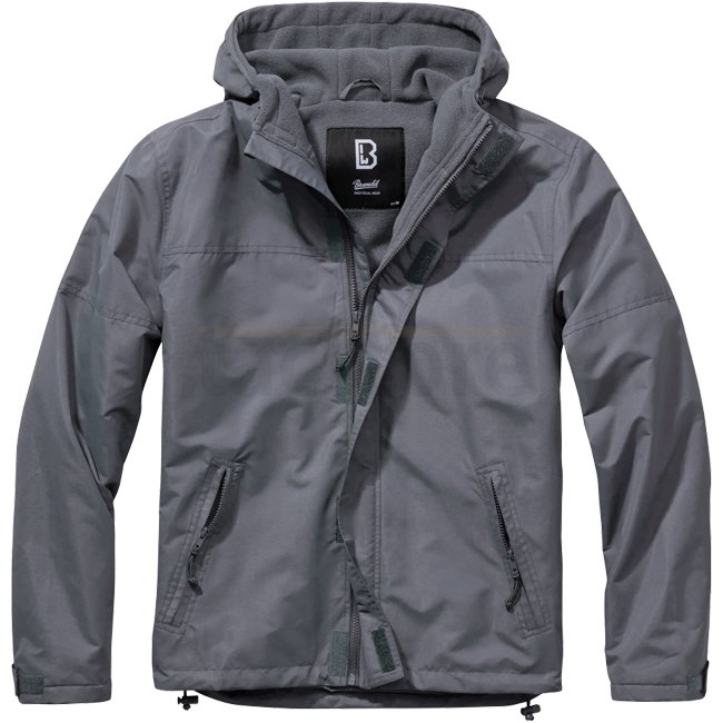 Restez au chaud et au sec avec le coupe-vent Brandit Frontzip en Anthracite - S. Matériau résistant au vent et à l'eau avec doublure en polaire chaude. Comprend une fermeture éclair frontale stable, une capuche doublée avec cordon de serrage et plusieurs