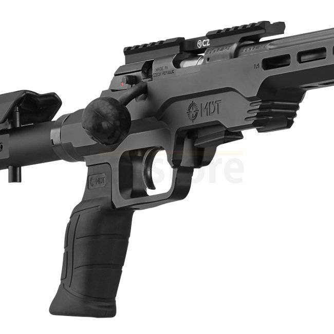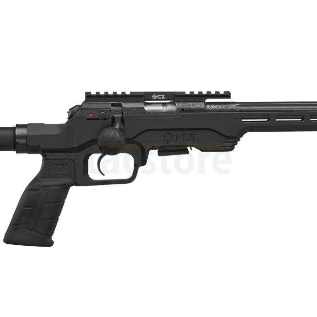 La CZ 457 MDT est un modèle sportif doté d'un châssis en duralumin attrayant de la marque renommée MDT. Son canon flûté avec chambre MATCH est équipé d'un compensateur, et la crosse comprend un appuie-joue réglable en hauteur. La longueur de traction (LOP) peut être ajustée à l'aide des quatre entretoises de plaque de couche incluses. Le rail de montage Picatinny avec une inclinaison de 25 MOA permet un réglage facile de la lunette de visée, même à des distances plus longues.