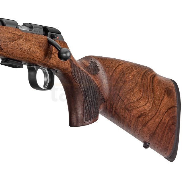 La CZ 457 Premium Version Gaucher dispose d’une crosse ergonomique en noyer, assurant une prise en main confortable et une stabilité de tir améliorée. L’appuie-joue optimise le confort, tandis que l’embout décoratif ajoute une touche d’élégance. La détente réglable permet un ajustement précis du poids de départ.