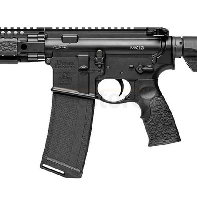 Le Daniel Defense MK12 5.56 NATO est l’évolution du Special Purpose Rifle. Il est construit autour d’un canon en acier inoxydable forgé à froid de 457 mm dont la chambre est formée lors du processus Cold Hammer Forging afin d’assurer l’alignement le plus précis possible entre la chambre et le alésage. Cela, associé à un traitement DLC, se traduit par une précision et une durabilité exceptionnelles. Le MK12 utilise un système à gaz direct-impingement en longueur rifle avec un bloc-gaz basse-profil MK12 usiné selon les spécifications Crane, et est équipé d’un rail Picatinny quad flottant de 12 pouces pour accueillir optiques et accessoires de mission.