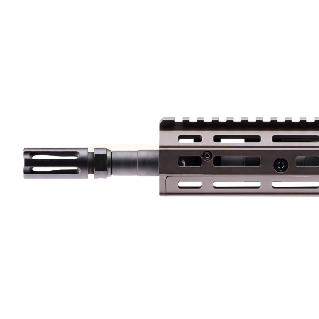 - Flash suppressor Daniel Defense prolongé, vernieté et soudé, acier inoxydable 17-4 PH, finition salt-bath nitride (montage d’usine).