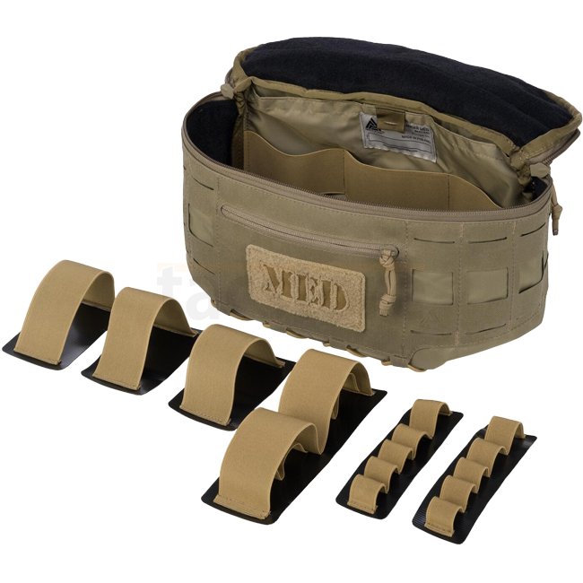 Le sac ceinture Lysander MED offre un moyen compact de transporter le matériel médical essentiel à utiliser. Grâce à sa forme ergonomique, il se place sous le porte-plaque, ce qui est particulièrement utile lors d'interventions dans des espaces restreints. Une poche zippée sur le devant permet de ranger des gants de protection, tandis qu'un patch médical peut être fixé à l'aide de Velcro à l'extérieur. Le compartiment principal se ferme avec une fermeture éclair bidirectionnelle et sa doublure douce en Velcro peut être facilement configurée pour chaque équipement à l'aide des bandes spéciales incluses. Un autre compartiment au dos du sac accueille de grands bandages plats et se ferme grâce à une petite fermeture velcro. Il y a deux poches supplémentaires cousues sur le rabat de fermeture, une pour les ciseaux et l'autre pour les cartes d'accident TCCC. Un système compatible MOLLE/PALS découpé au laser est fixé sur les côtés du sac auquel peuvent être fixés des sacs supplémentaires pour bandages, garrots, etc. Le système compatible MOLLE/PALS continue jusqu'au fond du sac pour attacher des équipements supplémentaires tels qu'un COMBAT STRETCHER. En plus d'utiliser le système compatible MOLLE/PALS sur le fond, nous y avons attaché un cordon de serrage tissé pour des options de fixation supplémentaires.