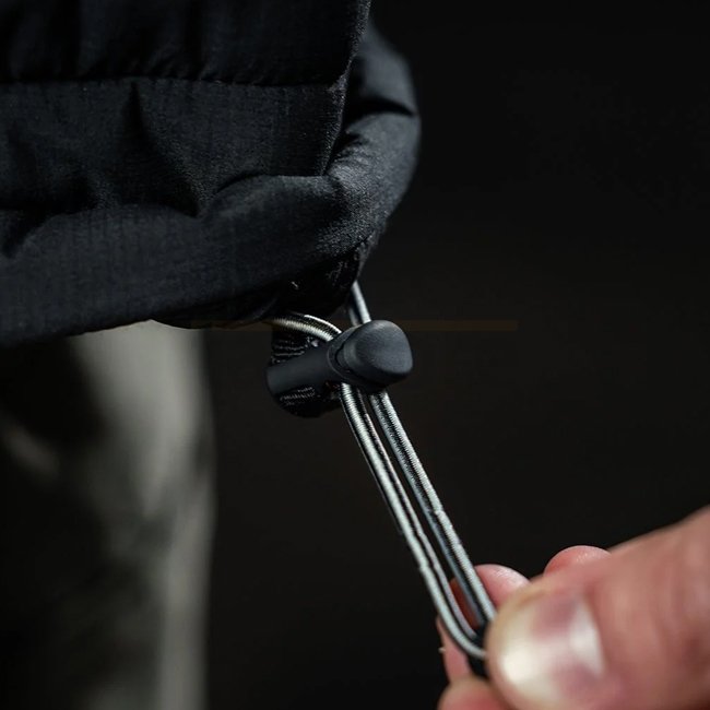 Un cordon de serrage à deux points au niveau de la taille permet un ajustement précis et un maintien optimal de la chaleur. La veste peut être repliée dans sa propre poche droite, ce qui la rend facile à transporter ou à ranger en déplacement.