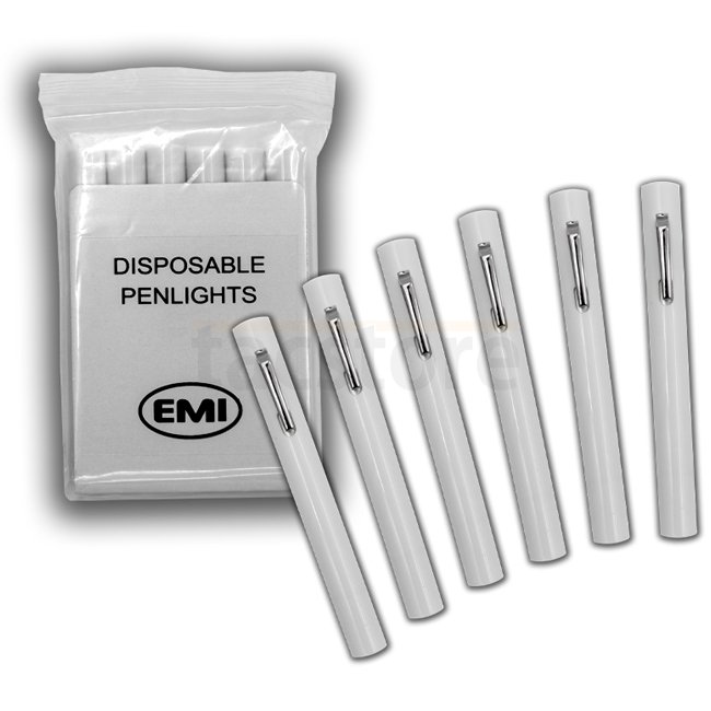 EMI Stylo lumineux jetable paquet de six - Blanc : Stylo lumineux de diagnostic jetable, taille compacte de 127 x 12,5 mm, proposé en paquet pratique de 6, facilement activé en appuyant sur la pince de poche.