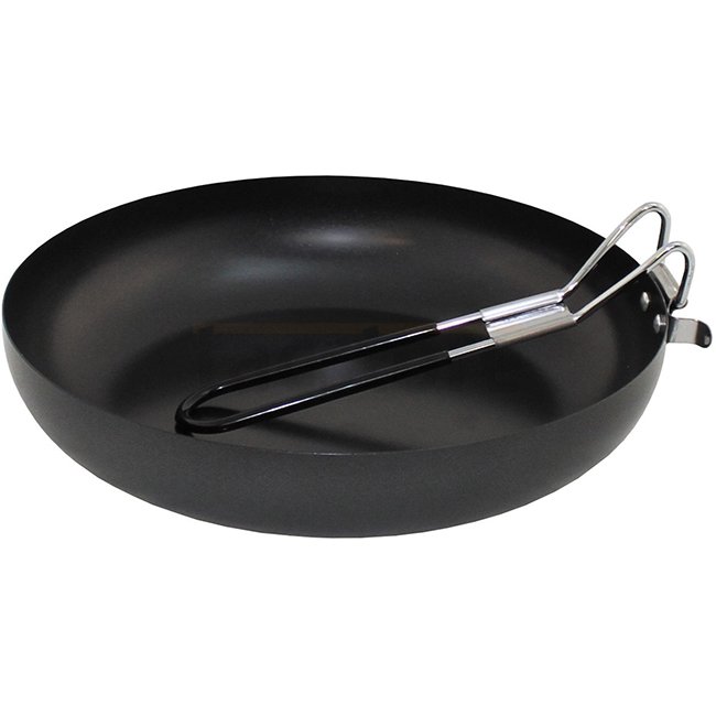Poêle à frire Compact FoxOutdoor, design pliable avec poignée recouverte de caoutchouc. Dispose d'un revêtement antiadhésif pour une cuisson facile. Non adapté pour le feu ouvert. Dimensions : 24 x 5 cm, Poids : 460 g. Fabriqué en acier à 100 %.