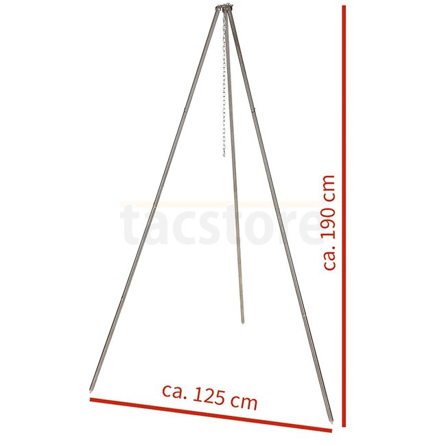 Chaîne à crochet et trépied FoxOutdoor 1,9 m, avec assemblage sans outil, hauteur réglable, pointes de sol stables, en acier inoxydable. Poids : environ 2,9 kg.