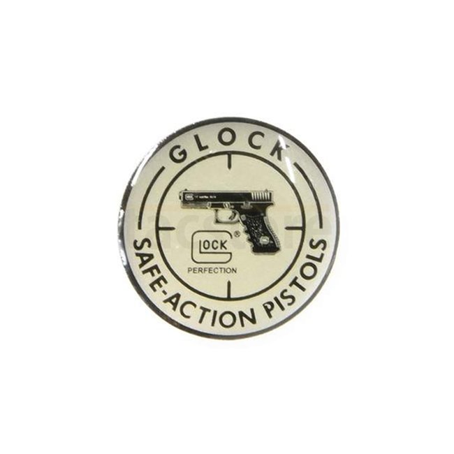Pin Glock - Argent : Environ 20mm de diamètre, design argenté élégant.