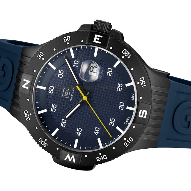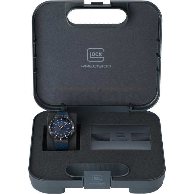 Enfermé dans un boîtier en acier inoxydable sablé avec une finition gunmetal, le cadran bleu affiche des aiguilles et des indices avec Swiss Super-LumiNova® ainsi qu’une aiguille des secondes jaune remarquable. Un bracelet en silicone bleu avec le logo GLOCK entoure le poignet, offrant un look sportif. Alimentée par un mouvement suisse et résistante à l’eau jusqu’à 20 ATM, cette montre incarne durabilité et résilience.
