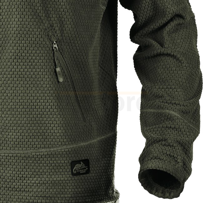 Veste en polaire tactique Helikon-Tex Alpha - Olive - XL : Couche d'isolation de base avec panneaux en velcro pour personnalisation, poches pour biceps et doublure en mesh. Légère, compressible et idéale pour les conditions froides.