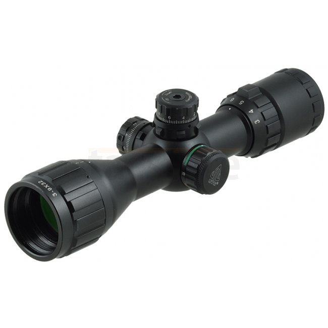 Cette lunette Leapers 3-9x32 possède une illumination Mil-Dot RVB, un tube de 30mm, et un réglage de 1/4 MOA. Construction légère en aluminium avec des anneaux de montage de 25.4mm inclus.