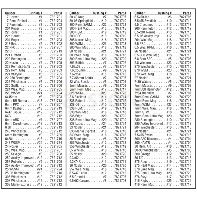 - 10 bagues pour calibres populaires incluses: .22, 6mm, 6.5mm, .270, 7mm, .30, .338, .35, .44 et .45
