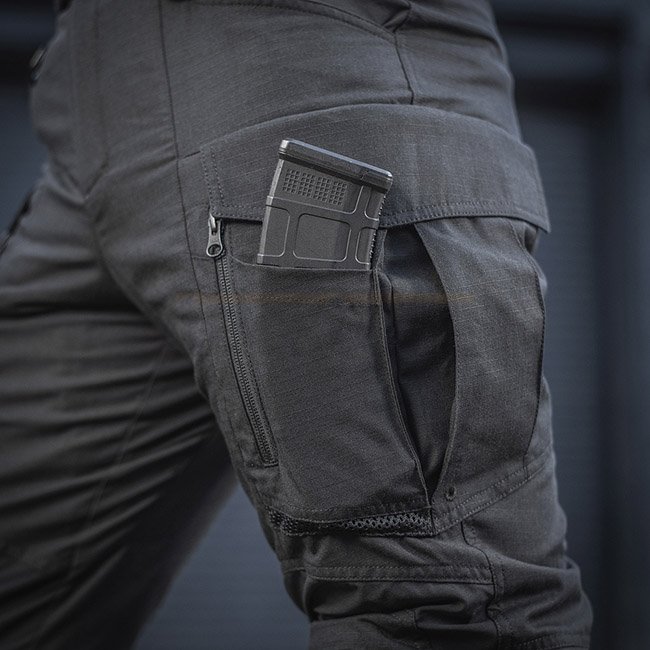 La poche cargo à rabat asymétrique est équipée d'une poche plaquée supplémentaire, qui peut contenir un chargeur M4 ou AK. La poche cargo elle-même est assez spacieuse. Il a deux plis, grâce auxquels sa taille peut être augmentée pour transporter des objets volumineux. De plus, la poche cargo est équipée d'une seconde entrée zippée, qui permet d'accéder à son contenu en position assise. Le bas des poches cargo a une maille pour une ventilation supplémentaire.