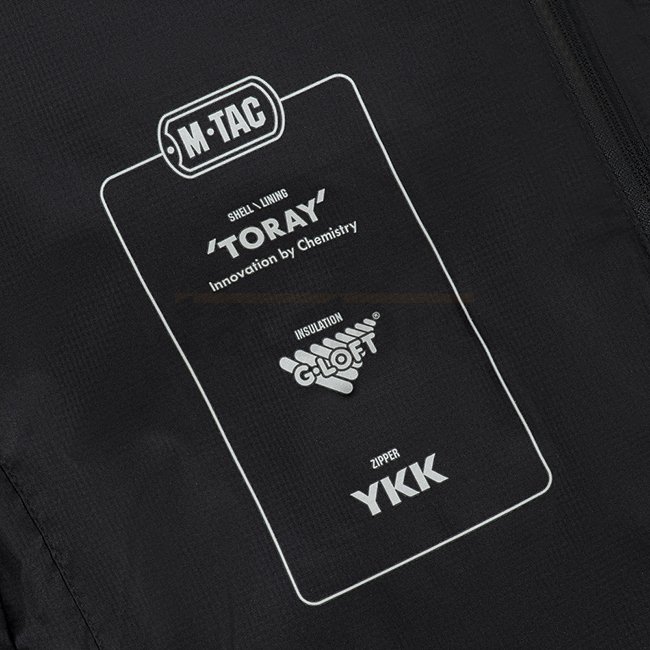 Fabriqué en tissu de nylon léger, respirant et hydrofuge de la société japonaise Toray. La veste est isolée avec une isolation autrichienne innovante G-Loft d'une densité de 100 g / m2, qui possède des qualités d'isolation thermique élevées et évapore facilement l'humidité lorsqu'elle est mouillée. De plus, cette matière allie organiquement la douceur du duvet et la résistance des fibres synthétiques.