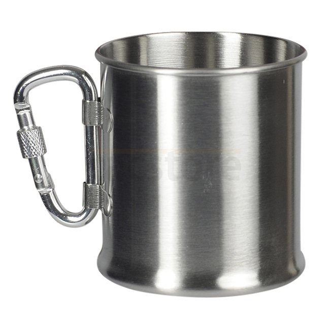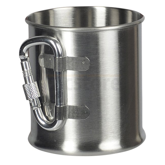 Mug en acier inoxydable avec un mousqueton et un volume de 250ml. La carabine est utilisée à la place de la poignée et se fixe à votre équipement lorsqu'il n'est pas utilisé.