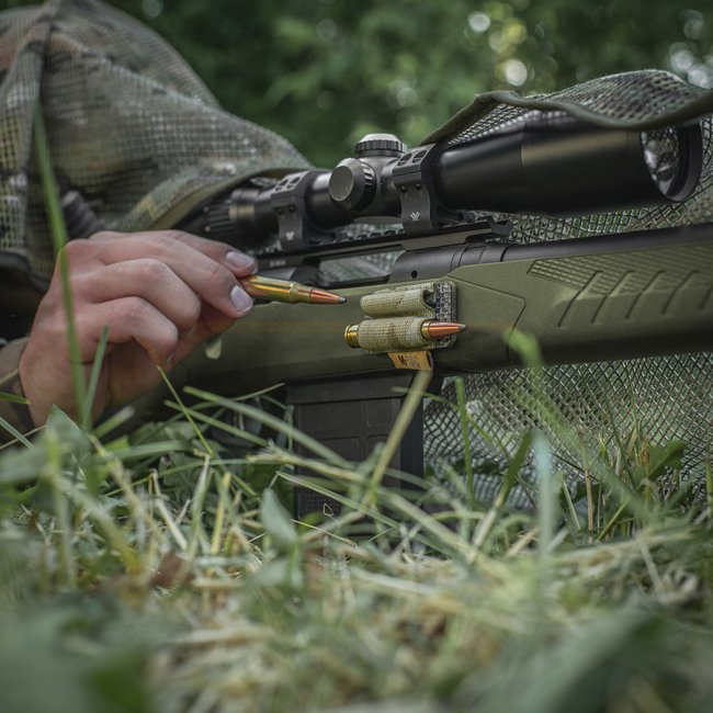 La conception du produit est une plate-forme en carbone avec une sangle élastique qui fixe de manière fiable deux coques de calibre .338 (8,6×70 mm). Le panneau Velcro est fixé à la crosse ou au boîtier à l'aide d'une base adhésive polymère 3M. Ce porte-obus est fixé à l'arme à l'aide d'un panneau Velcro, qui peut être retiré si nécessaire sans déconnecter la base Velcro du fusil.