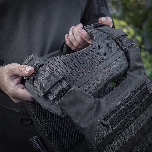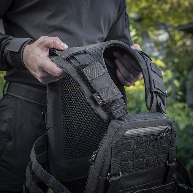 Le M-Tac Cuirass QRS Plate Carrier Shoulder Damper en noir est conçu pour un confort accru et une répartition de la charge lors du port d'équipement. Fabriqué en Cordura 500D, il offre durabilité et ventilation avec des panneaux en maille 3D. Facilement a