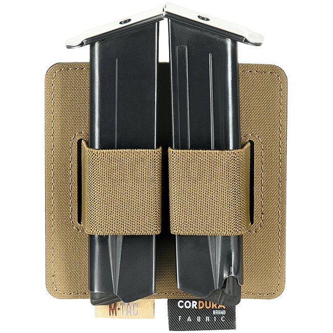 Poche double chargeur compact M-Tac de couleur Coyote, conçue pour transporter deux chargeurs de pistolet ou des objets similaires comme un outil multifonction ou une petite lampe. Fermeture en Velcro, volume ajustable. Matériau Cordura 1000D. Dimensions