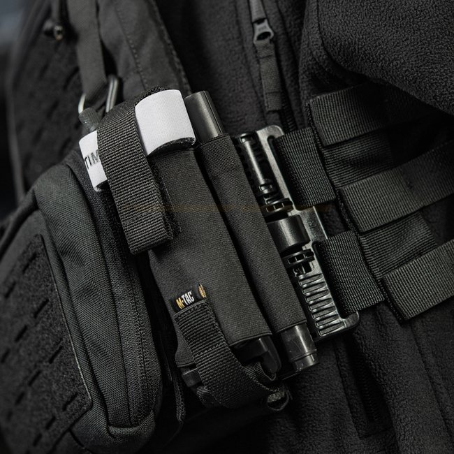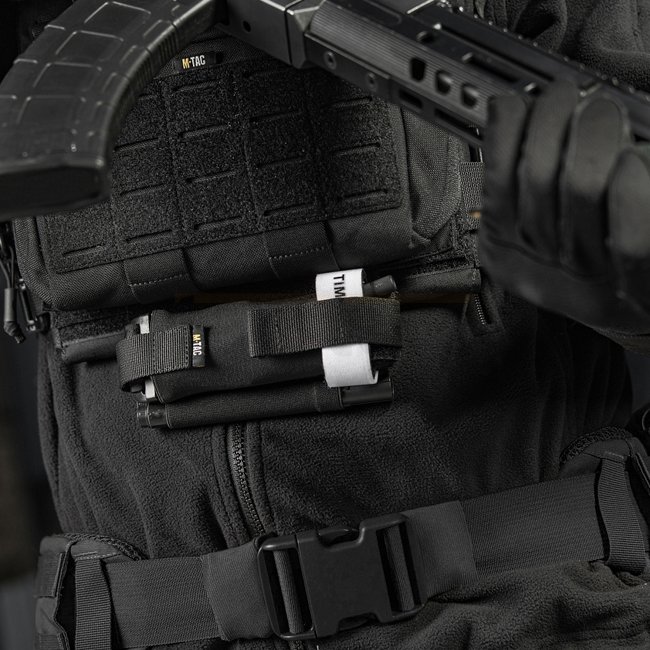 La fixation du garrot est constituée d'un large élastique qui fixe le garrot de manière fiable. Les éléments de fixation supplémentaires sont des sangles, ce qui empêche toute chute accidentelle. De plus, dans cette génération, les designers de la marque ont ajouté un élastique pour attacher un marqueur. Grâce à la conception bien pensée de l'emballage, vous pouvez retirer instantanément le garrot et l'appliquer très rapidement. Ce modèle se fixe sur le panneau Velcro frontal sous ou sur le côté du plate-forme du porte-plaque, augmentant ainsi sa fonctionnalité.
