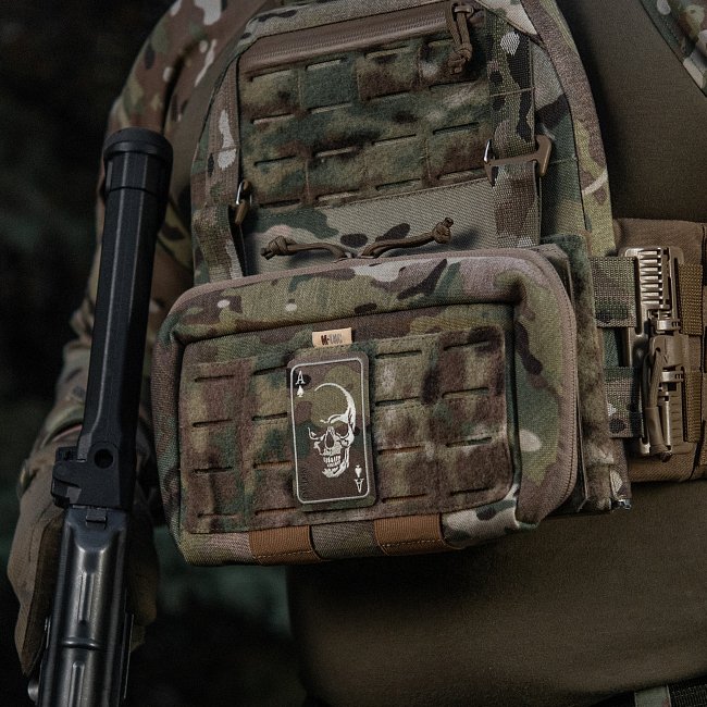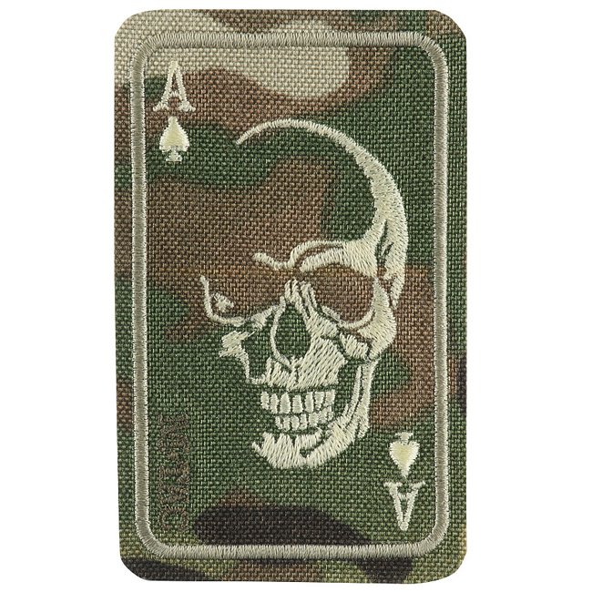 Patch M-Tac Brodé "Visage de Guerre" représentant un crâne sur un design de carte As de Pique. Symbolise l'audace face au danger. Fabriqué avec un devant en Cordura 500D et un dos à surface auto-agrippante. Dimensions : 85 x 52 mm.