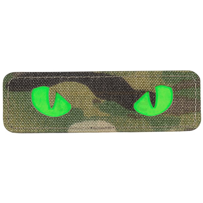 Patch "Yeux de Chat Vert" découpé au laser en motif Multicam, avec un matériau avant en Cordura 500D durable et un dos à surface auto-agrippante. Dimensions 80 x 25 mm.
