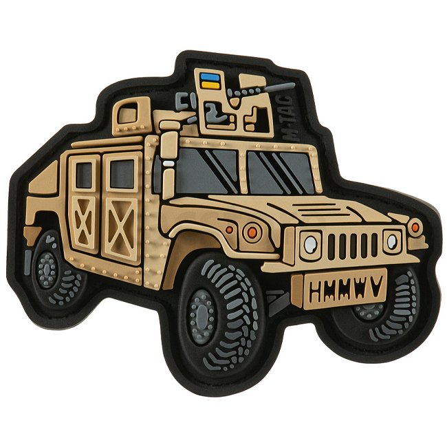 Patch en caoutchouc M-Tac HMMWV - Coyote, fabriqué avec une face avant en PVC et une face arrière à surface auto-agrippante, mesurant 80 x 64 mm.