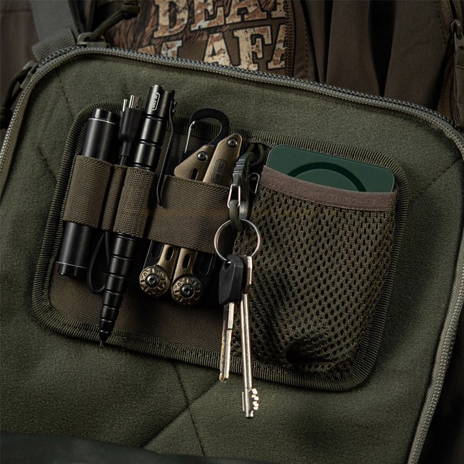 Un organisateur modulaire qui peut être attaché dans un sac ou un sac à dos à l'aide d'une surface en velcro ou en velours. Aide à organiser l'espace dans votre sac de tous les jours afin que tous les éléments essentiels soient à portée de main. Des attaches élastiques pour stylo tactique, lampe de poche, porte-clés, multitool, couteau, téléphone et autres gadgets utiles vous seront utiles pour transporter votre kit EDC. Le module est également équipé d'un porte-clés.