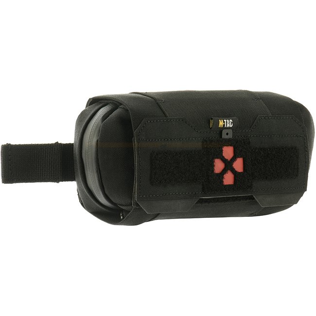 Pochette Médicale Horizontale M-Tac Elite - Noire : Équipement essentiel de trousse de premiers soins avec organiseur en Cordura 500D, fermeture éclair AquaGuard, base attachable pour surfaces MOLLE, et option de passant pour ceinture.
