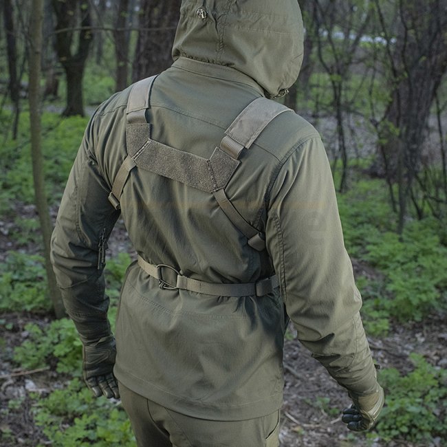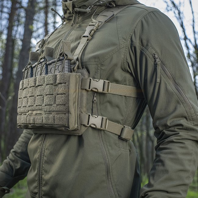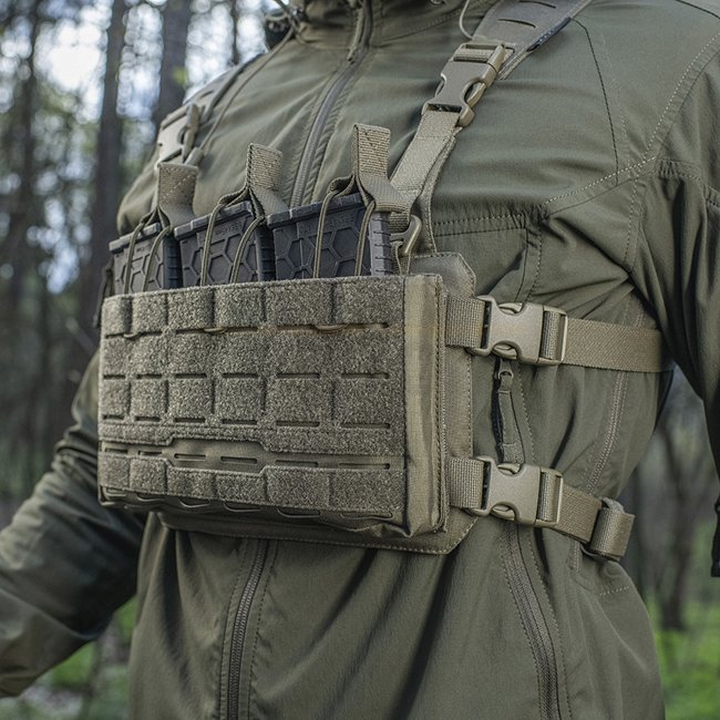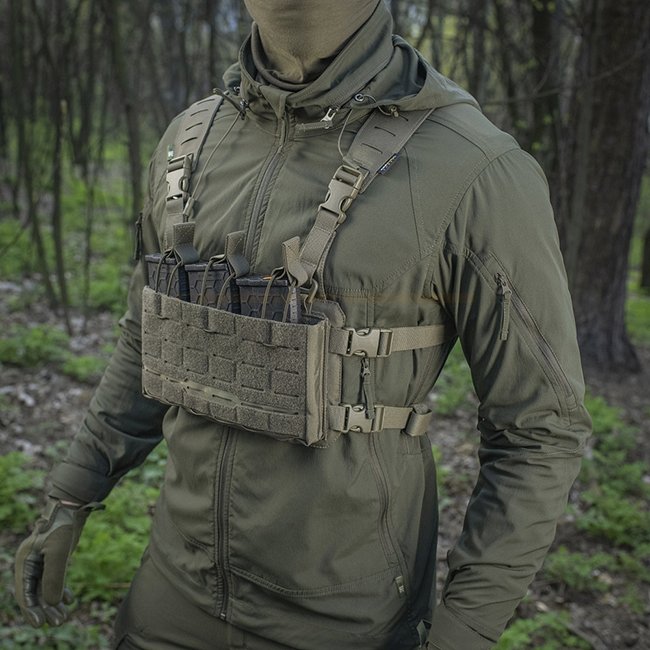 Le Modular Chest Rig est un Chest Rig tactique qui allie polyvalence et confort. Fabriqué en matériau Cordura 500D de haute qualité et durable. Le panneau avant est conçu pour trois magazines et est solidement fixé à la base à l'aide de crochets Woojin et de velcro. Des sangles spéciales fixent les magazines et les empêchent de perdre accidentellement. La surface frontale du système MOLLE permet de fixer un équipement supplémentaire. De plus, ce panneau peut être retiré et remplacé par tout autre insert modulaire compatible avec la fermeture Velcro.