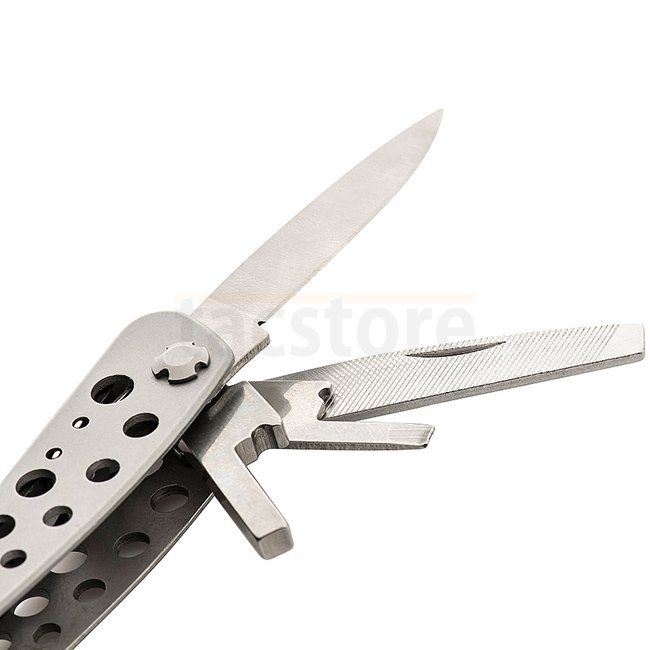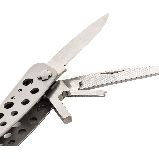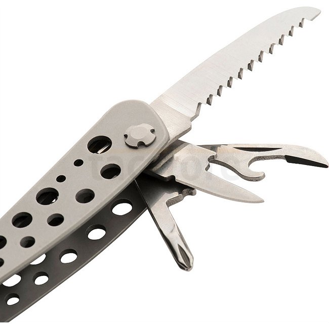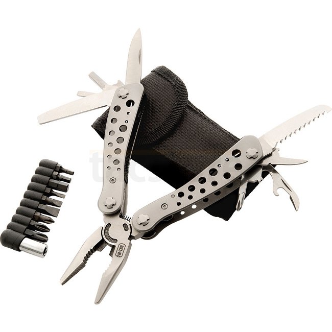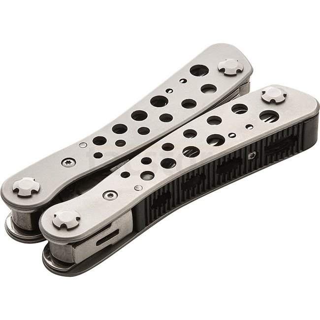 Multitool de haute qualité, fiable et relativement peu coûteux. Le kit comprend les outils les plus nécessaires et les plus souhaités pour un usage quotidien : pinces et pinces coupantes, tournevis, scies, ouvre-boîtes et ouvre-bouteilles, et même une lime, le tout dans un ensemble compact et pratique qui ne prend pratiquement pas de place lorsqu'il est fermé.