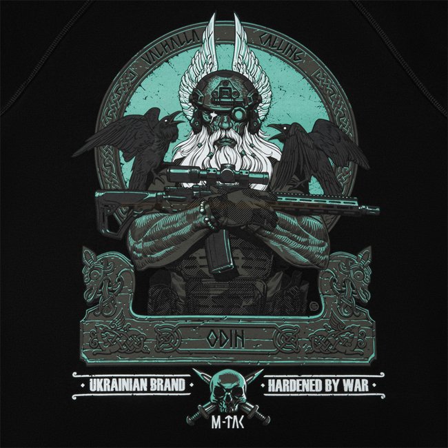 M-Tac Odin Mystery Raglan - Noir - M est un T-SHIRT À MANCHES LONGUES THÉMATIQUE ODIN MYSTERY représentant un Odin déterminé en tenue de combat moderne, prêt à mener ses guerriers dans la bataille finale. Avec Odin équipé d’un fusil AR-15 et accompagné de