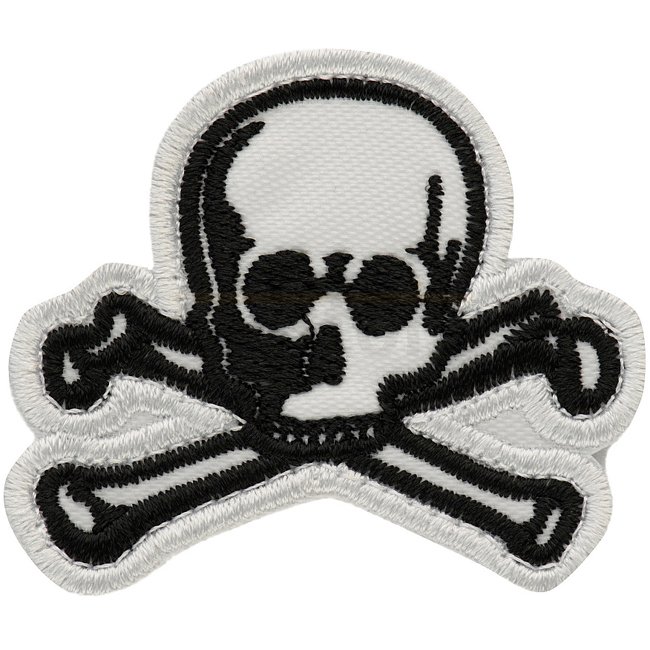 Écusson M-Tac Old Skull brodé en blanc, avec des dimensions de 45x55mm, doté d'une surface à crochet à l'arrière et d'un matériel textile à l'avant.