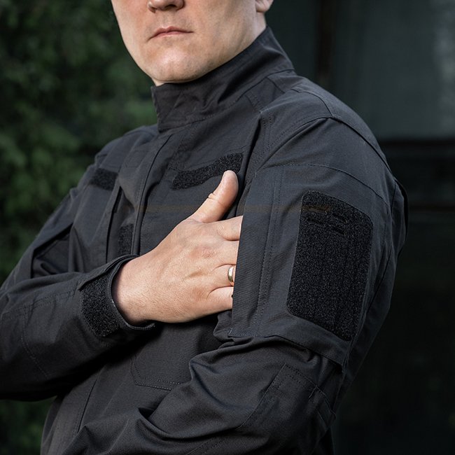 Dans la partie supérieure du dos, il y a un empiècement renforcé avec un panneau velcro pour un marqueur IR sous le col, des plis d'expansion autour des bras aident à maintenir la liberté de mouvement, même lorsqu'un gilet pare-balles est porté. Les manches sont équipées d'une poche coude pour un insert souple. Les poignets sont réglables en largeur à l'aide de fermetures velcro.