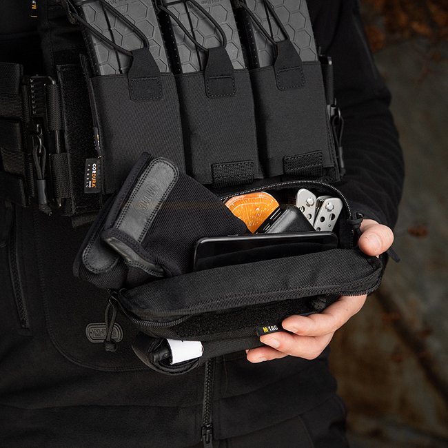 Pochette Accessoire Inférieure pour Porte-Plaque M-Tac Gen.II Elite - Noir. Fabriqué en matériau Cordura 500D. Attachable au panneau Velcro avant du porte-plaque. Comprend une boucle élastique pour un garrot.