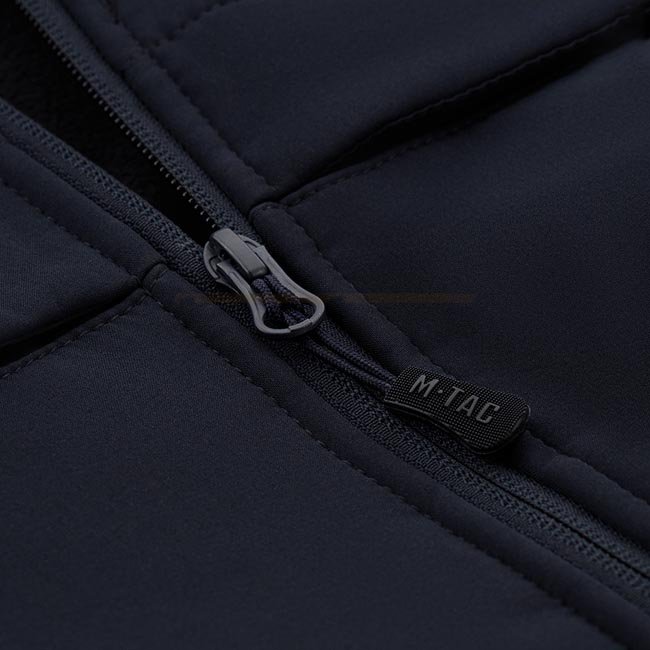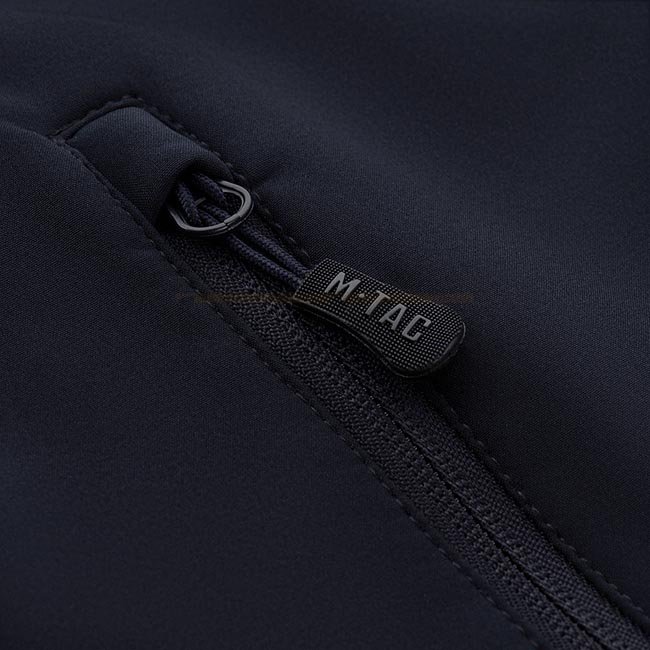 Veste de police Soft Shell M-Tac en bleu marine - S. Fabriquée en membrane de polyuréthane intercalée pour une protection contre les intempéries. Comprend une fine couche de polaire, deux panneaux d'identification, un accès par le côté du bras et des cara